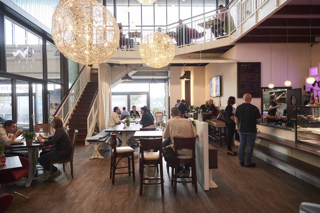 Im Innenraum der lichtdurchfluteten Hafenbrise ist Platz für bis zu 80 Personen, auf der Terrasse direkt am Europahafen für 50 Gäste. ©team neusta GmbH